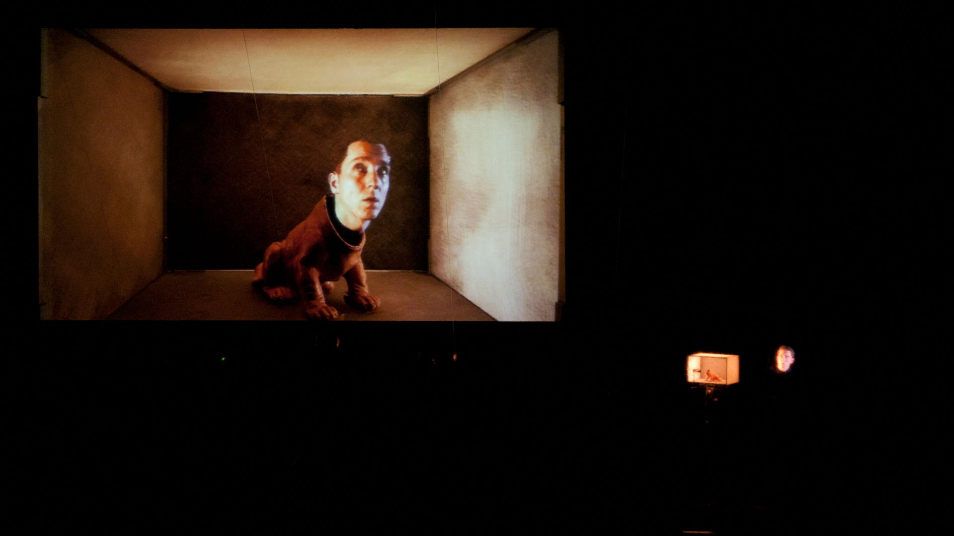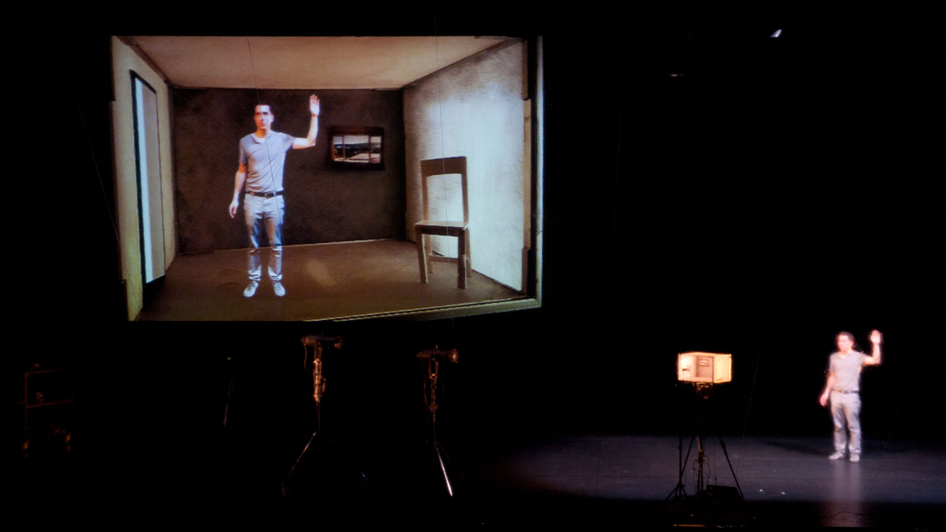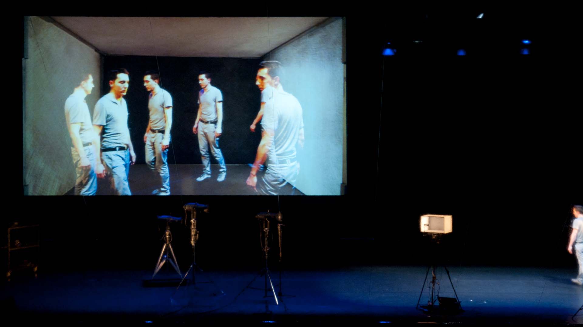 Machacek instigates a sophisticated game. As a performer, he has himself projected into a small model box, which is once a stage, then a movie set room and a display case. In an ingenious setting of cameras, projection screens and sound equipment, the artist leads us through a pandemonium of illusions.
