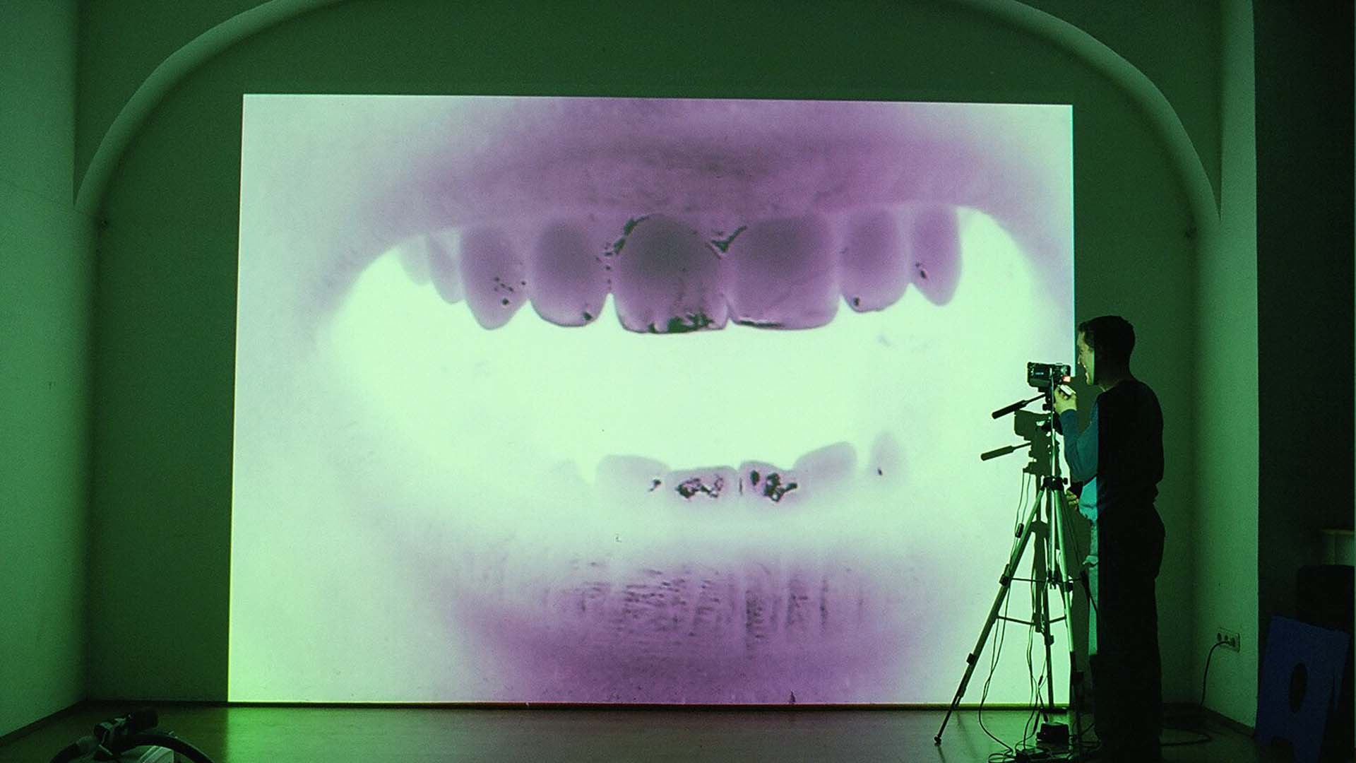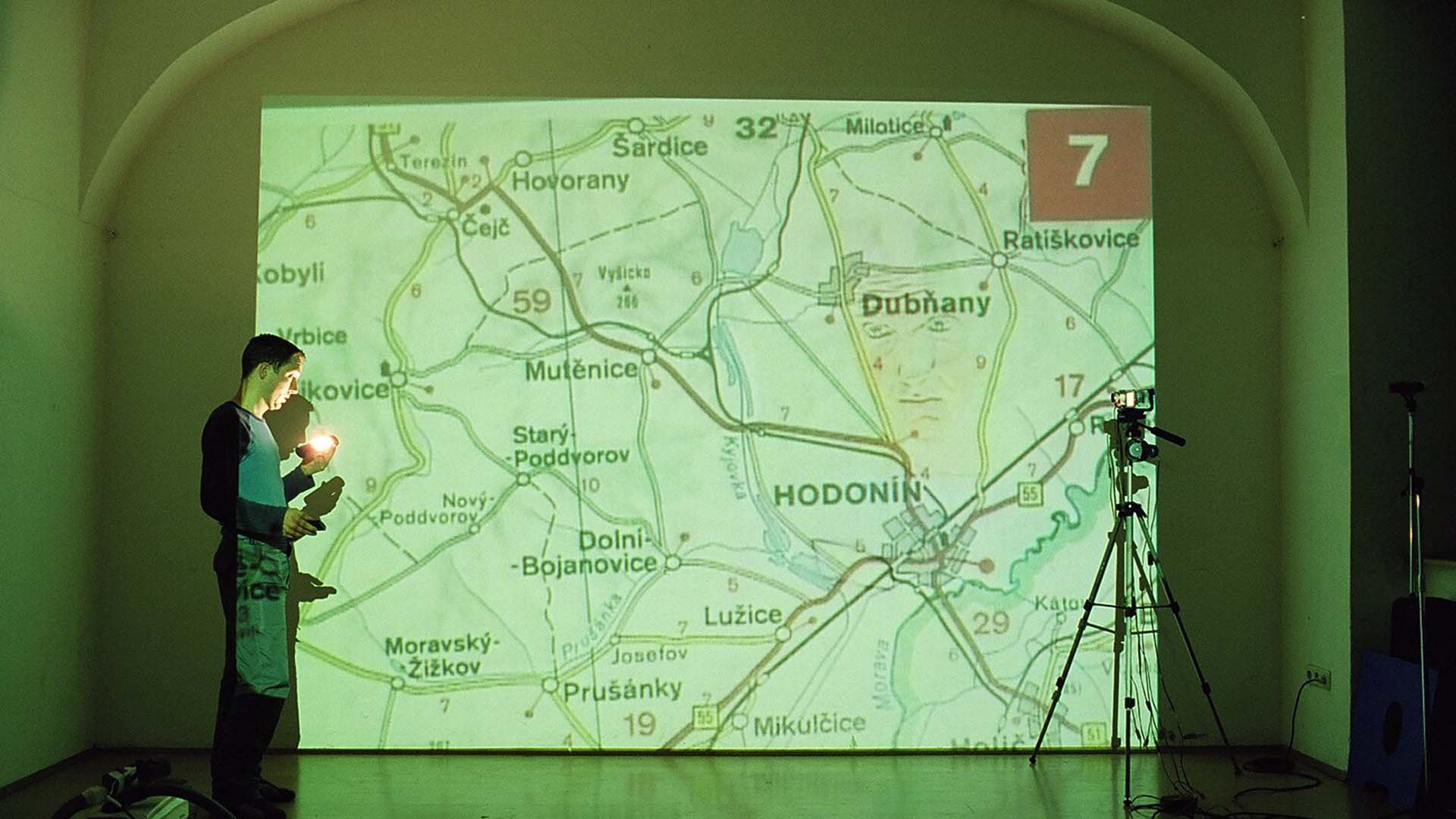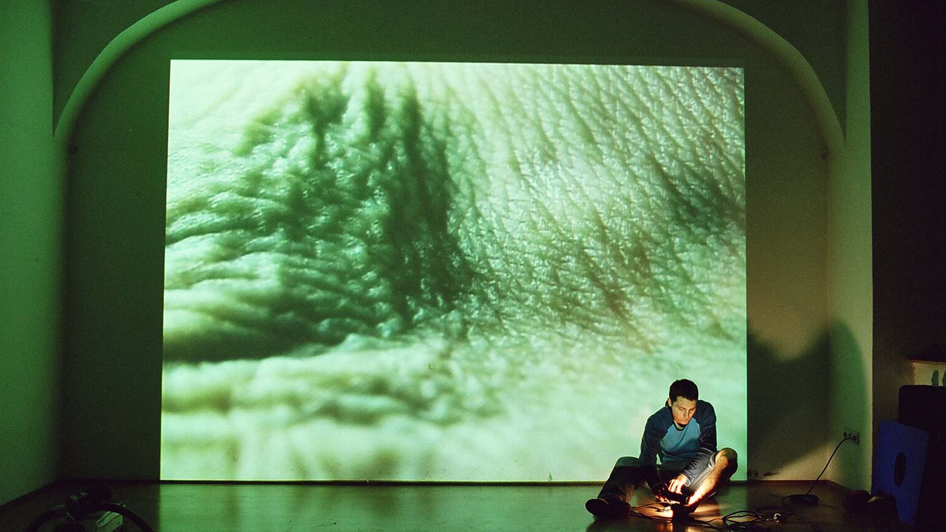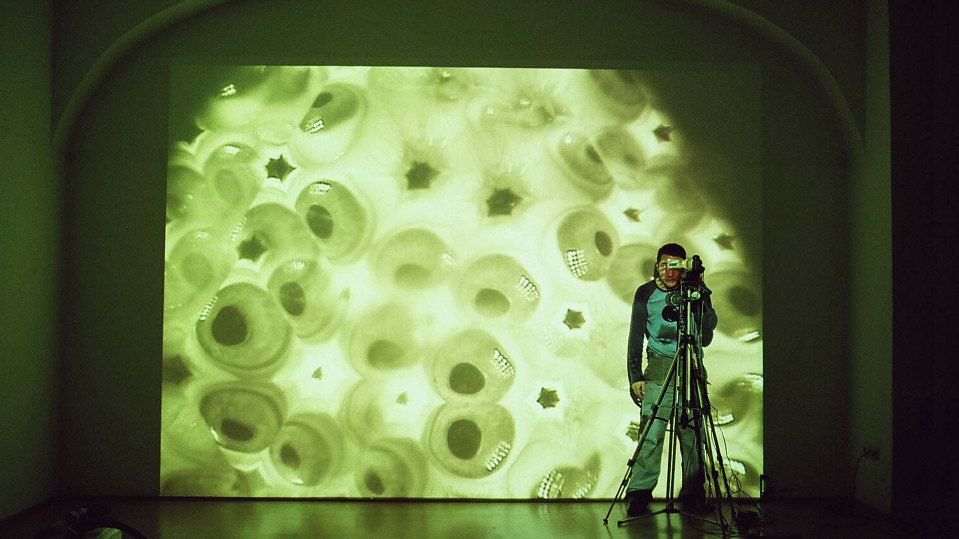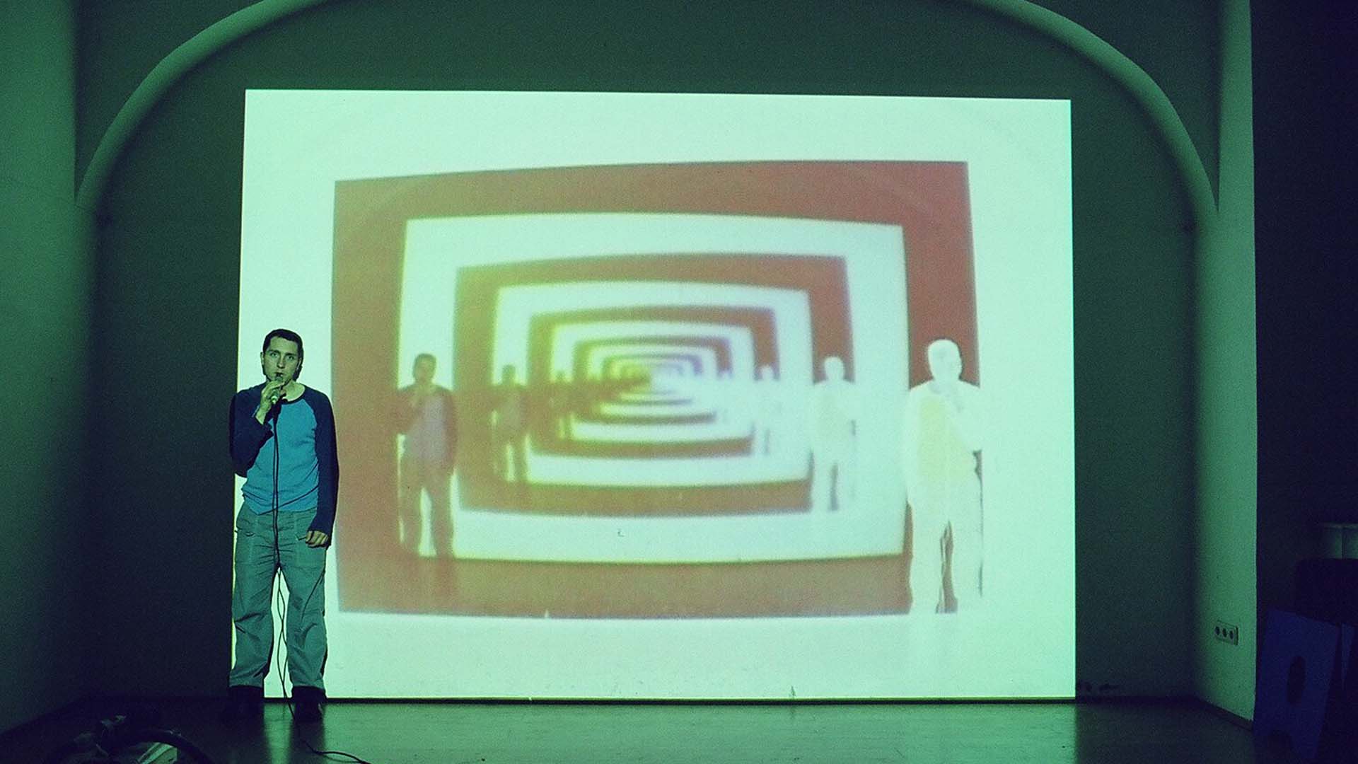 A performer communicates with his video image and is duplicated, mirrored, enlarged and deleted in the process. He controls these processes and becomes increasingly entangled in them. His playful use of the video camera, his singing and his imitation of media poses create a hybrid of one-man show and personal drama.